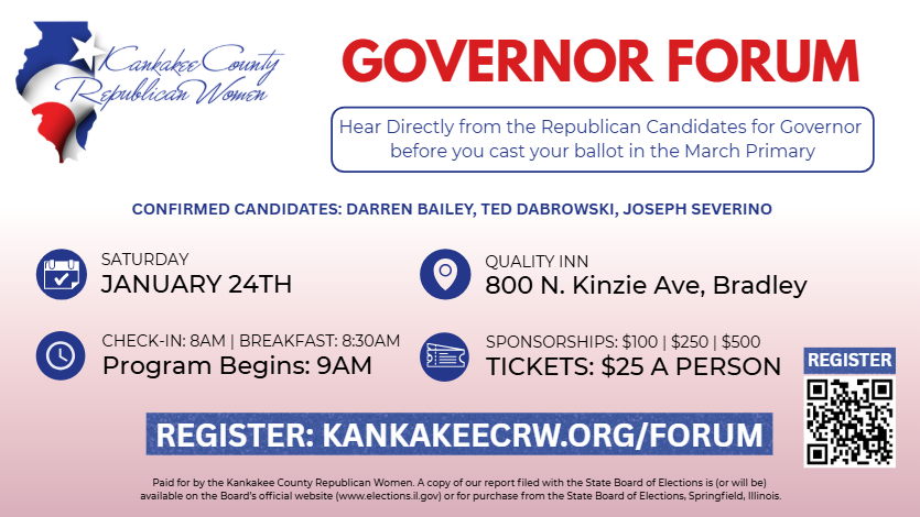 Kankakee County Republican Women Governor Forum Hear directly from the Republican Candidates for Governor before you cast your ballot in the March Primary. Confirmed Candidates: Darren Bailey, Ted Dabrowski, Joseph Severino Saturday, January 24th Check-In: 8AM | Breakfast: 8:30AM | Program Begins: 9AM Quality Inn 800 N Kinzie Ave, Bradley, IL Tickets: $25 a Person […]