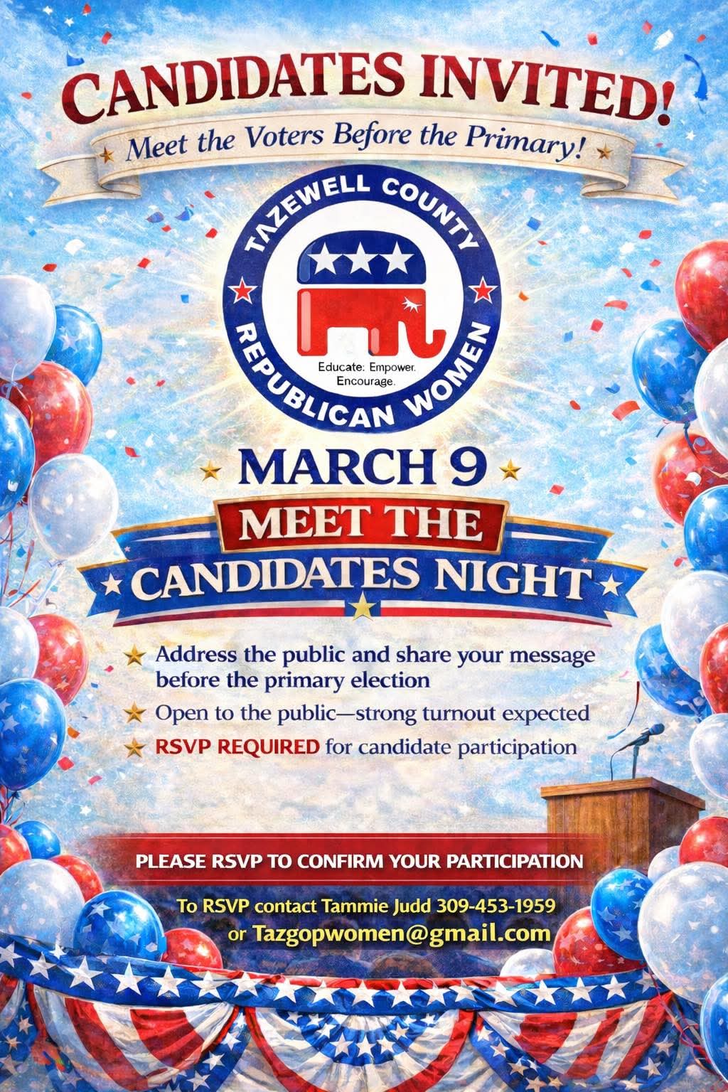 Tazewell County Republican Women Meet the Candidates Night March 9th Address the public and share your message before the primary election. Open to the public – strong turnout expected. RSVP required for candidate participation. ————– Please RSVP to confirm your participation To RSVP contact Tammie Judd at 309.453.1959 or Tazgopwomen@gmail.com