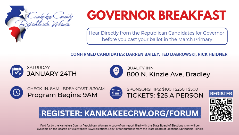 Kankakee County Republican Women Governor Forum Hear directly from the Republican Candidates for Governor before you cast your ballot in the March Primary. Confirmed Candidates: Darren Bailey, Ted Dabrowski, Rick […]